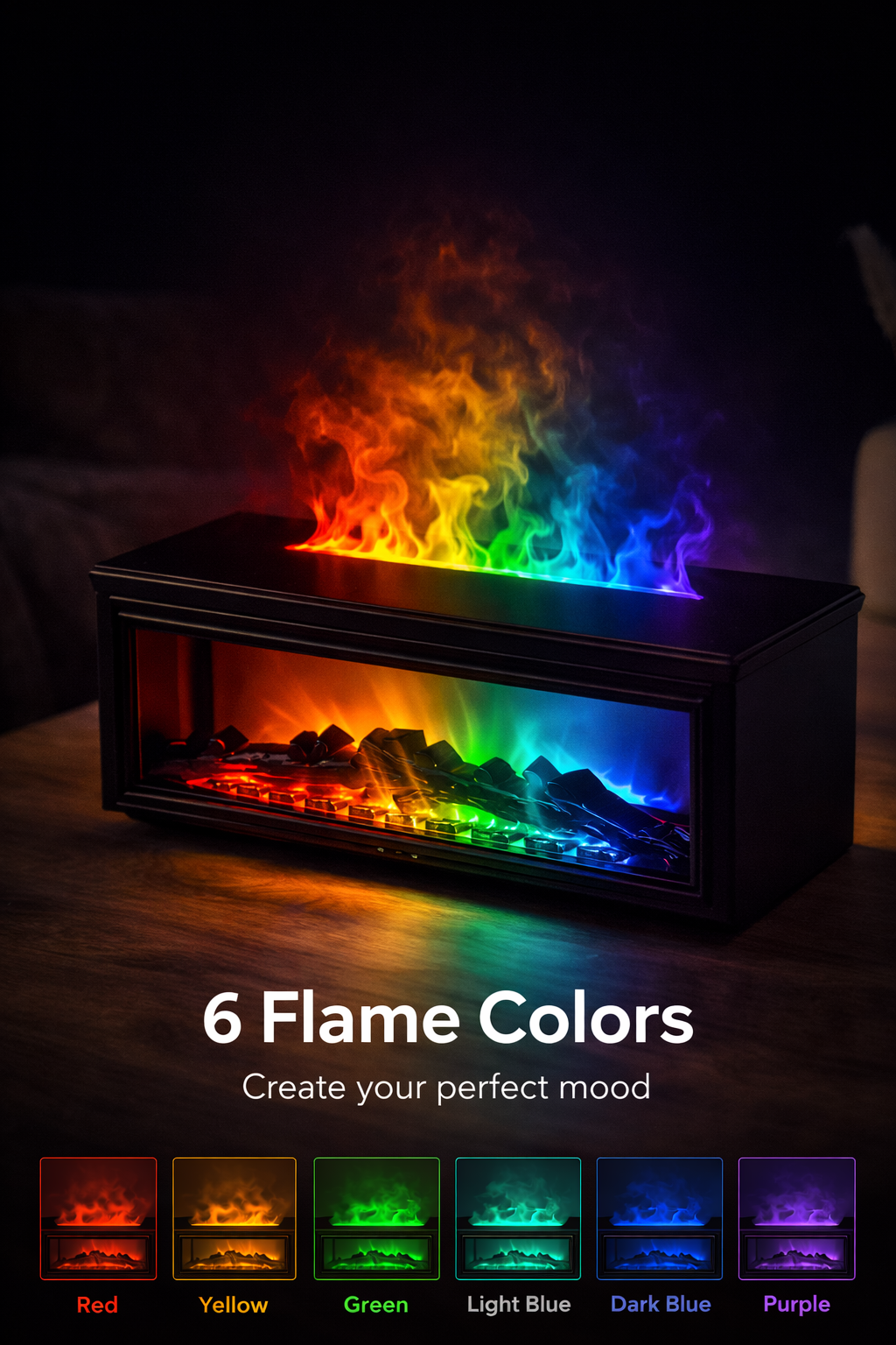 The device uses advanced LED lighting combined with ultrasonic mist to create a realistic flame-like effect — completely safe and heat-free.